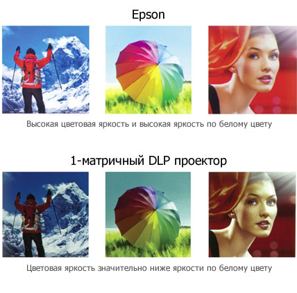 Это — реальные фотографии одновременно проецируемых изображений с одного источника сигнала. Цена, разрешение и яркость белого одинаковы для двух проекторов (Epson на технологии 3LCD и 1-матричный DLP). Оба проектора работают в одинаковых режимах с высокой яркостью.