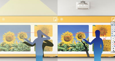 Проектор EB-475Wi обладает встроенными интерактивными функциями, которые позволяют превратить любую проекционную поверхность в интерактивную без использования дополнительного оборудования. Проектор поставляется с двумя электронными ручками-указками, с помощью которых учитель и ученик могут писать на доске одновременно, что способствует быстрой и эффективной совместной работе. Данные легкие и чувствительные ручки просты в использовании благодаря новой «парящей» функции, которая позволят аккуратно распознавать отсутствие контакта с проецируемой поверхностью. Кроме того EB-475Wi имеет специальный режим вертикальной проекции, с помощью которой любой стол может стать интерактивным.