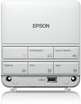 EB-1410Wi поставляется с внешней панелью управления проектором, которая делает управление и подключение к проектору других устройств простым и удобным. Через внешнюю панель к EB-1410Wi можно подключить компьютер, принтер, внешний USB-накопитель данных или внешние динамики. Внешняя панель также позволяет посылать на проектор часто используемые команды, например, отправить документ на печать, сохранить изображение, включить или выключить проектор и другие.